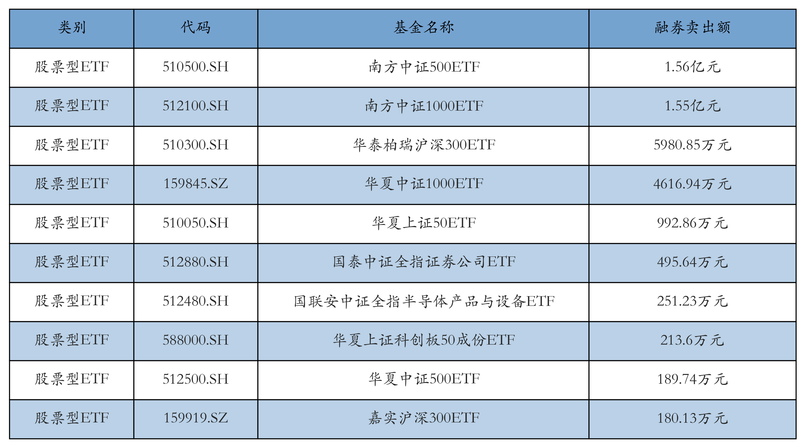 昨日股票型ETF融資賣出額最高的3只ETF及其賣出金額分別為:南方中證500ETF(1.56億元)、南方中證1000ETF(1.55億元)、華泰柏瑞滬深300ETF(5980.85萬(wàn)元)。融券賣出額前10詳情見(jiàn)下表: