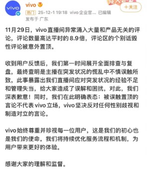 聲明稱,11月29日,vivo直播間異常涌入大量和產(chǎn)品無關(guān)的評論,評論數(shù)量高達平時的8.9倍,評論區(qū)的個別詆毀性評論被意外置頂。