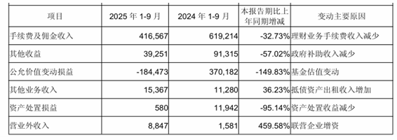 2025年前三季度業(yè)績(jī)報(bào)告顯示,該行手續(xù)費(fèi)及傭金凈收入3.75億元,同比大幅下降超過30%,間接拖累營(yíng)收表現(xiàn)。其中公允價(jià)值變動(dòng)損益以及其他債權(quán)投資公允價(jià)值變動(dòng)都由盈轉(zhuǎn)虧,分別虧損1.84億元及16.74億元,業(yè)績(jī)報(bào)告顯示主要原因是基金估值和債券估值變動(dòng)。上述因素直接導(dǎo)致該行整體非息收入大幅下滑。
