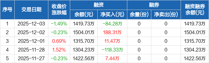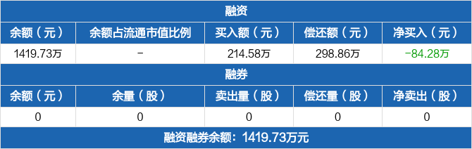 融資方面,當(dāng)日融資買入214.58萬元,融資償還298.86萬元,融資凈償還84.28萬元。融券方面,融券賣出0份,融券償還0份,融券余量0份,融券余額0元。融資融券余額合計(jì)1419.73萬元。