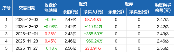 融資方面,當(dāng)日融資買入1510.24萬(wàn)元,融資償還922.84萬(wàn)元,融資凈買入587.4萬(wàn)元。融券方面,融券賣出0份,融券償還0份,融券余量0份,融券余額0元。融資融券余額合計(jì)2.47億元。