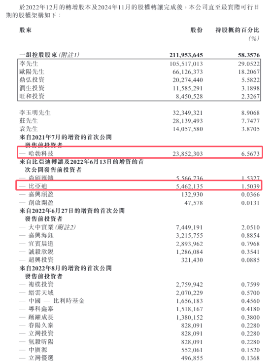 其中,在上市前,哈勃科技持有約6.57%的股份,比亞迪持有約1.50%的股份。