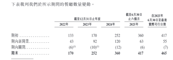 招股書顯示,遇見小面采用直營(yíng)或特許經(jīng)營(yíng)模式經(jīng)營(yíng)。其餐廳數(shù)量持續(xù)攀升,財(cái)務(wù)業(yè)績(jī)亦取得快速增長(zhǎng)。自2022年初至今,遇見小面的餐廳數(shù)量已由133家增長(zhǎng)249.6%至465家。從其開店數(shù)據(jù)來看,其開店速度不斷加快,2022年新開43家,2023年新開92家,2024年新開120家,而2025年至今已新開118家。