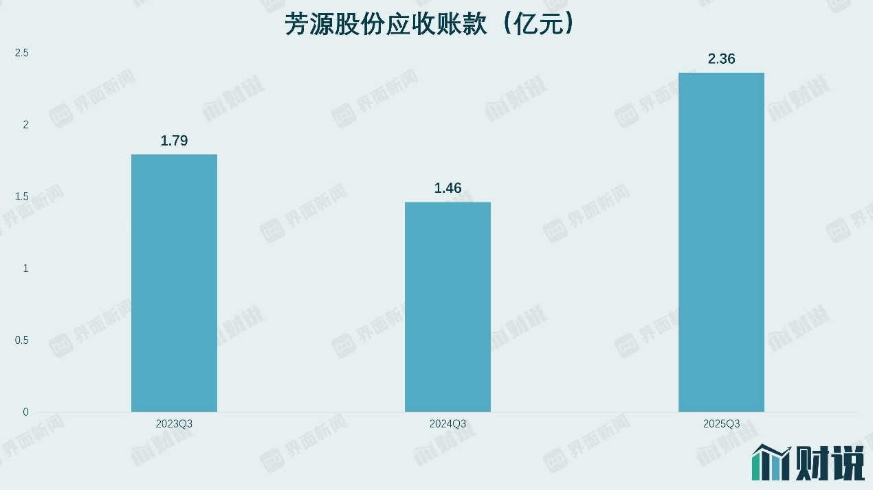 其次是應(yīng)收賬款激增。截至9月底,芳源股份應(yīng)收賬款達(dá)2.36億元,同比大增62%。在營(yíng)收微增5.29%的情況下,應(yīng)收賬款大幅增長(zhǎng),說(shuō)明公司可能為了維持銷(xiāo)售規(guī)模,放寬了信用政策,導(dǎo)致貨款回收延遲。“應(yīng)收賬款激增表明公司的資金被下游客戶(hù)占用,這也會(huì)進(jìn)一步加劇公司的現(xiàn)金流壓力?!?林悅奕分析稱(chēng)。
