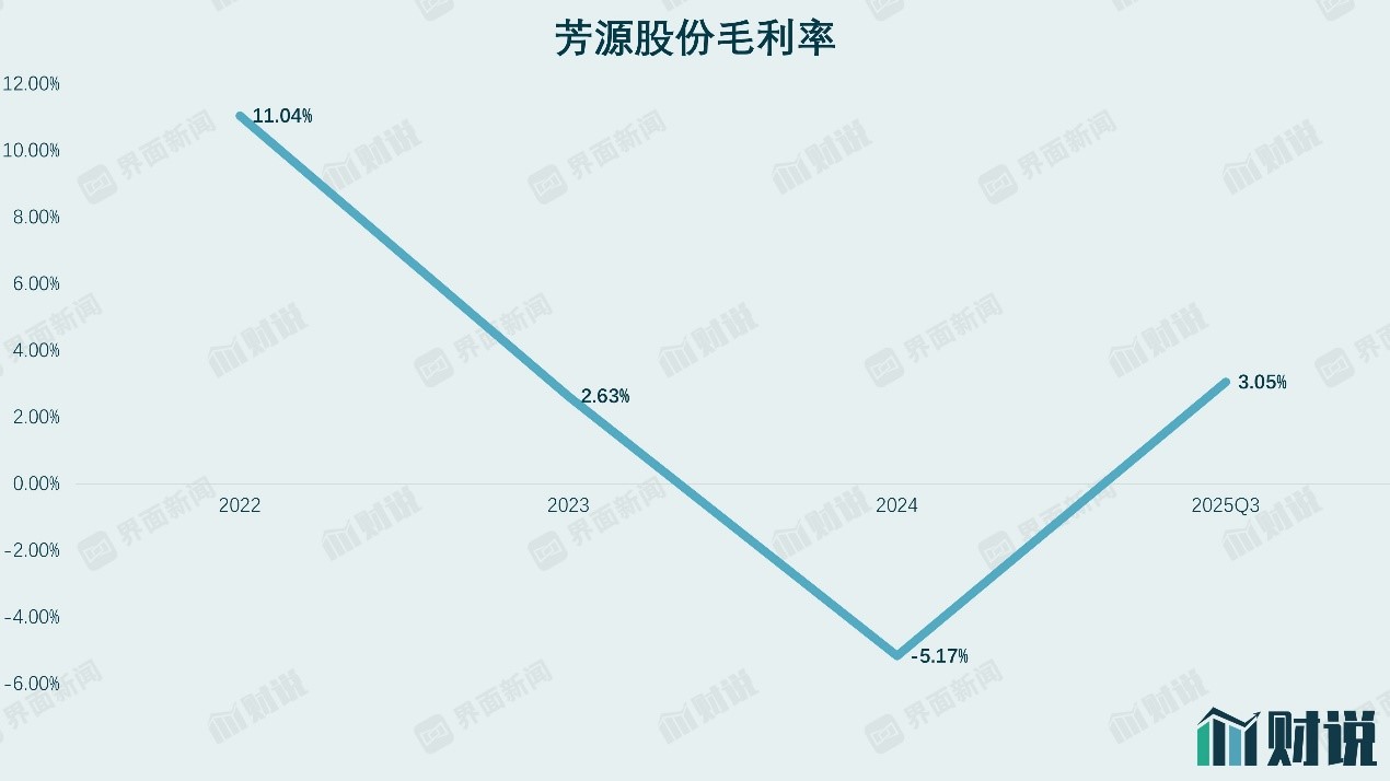 更為嚴(yán)峻的是,芳源股份的盈利能力持續(xù)惡化。2023年公司毛利率為2.63%,2024年下滑至-5.17%,2025年前三季度雖回升至3.05%,但仍處于行業(yè)低位。“3% 左右的毛利率幾乎沒(méi)有抗風(fēng)險(xiǎn)能力,一旦原材料價(jià)格出現(xiàn)小幅波動(dòng),就很容易再度陷入虧損。” 注冊(cè)會(huì)計(jì)師林悅奕對(duì)界面新聞?dòng)浾弑硎尽?/p>