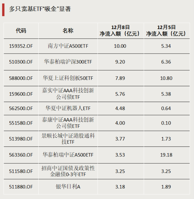12月8日,全市場凈流入額最高的ETF是南方中證A500ETF,達10億元;12月5日,全市場凈流入額最高的ETF是華泰柏瑞中證A500ETF,達19.18億元。