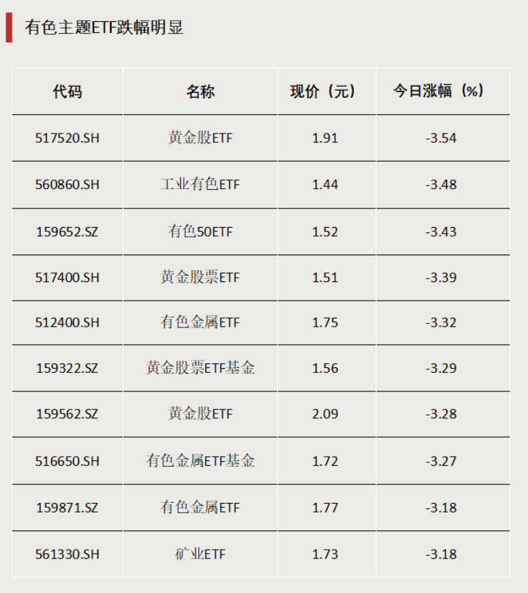 12月9日,有色、黃金等板塊表現(xiàn)疲軟,多只相關(guān)主題ETF跌超3%。