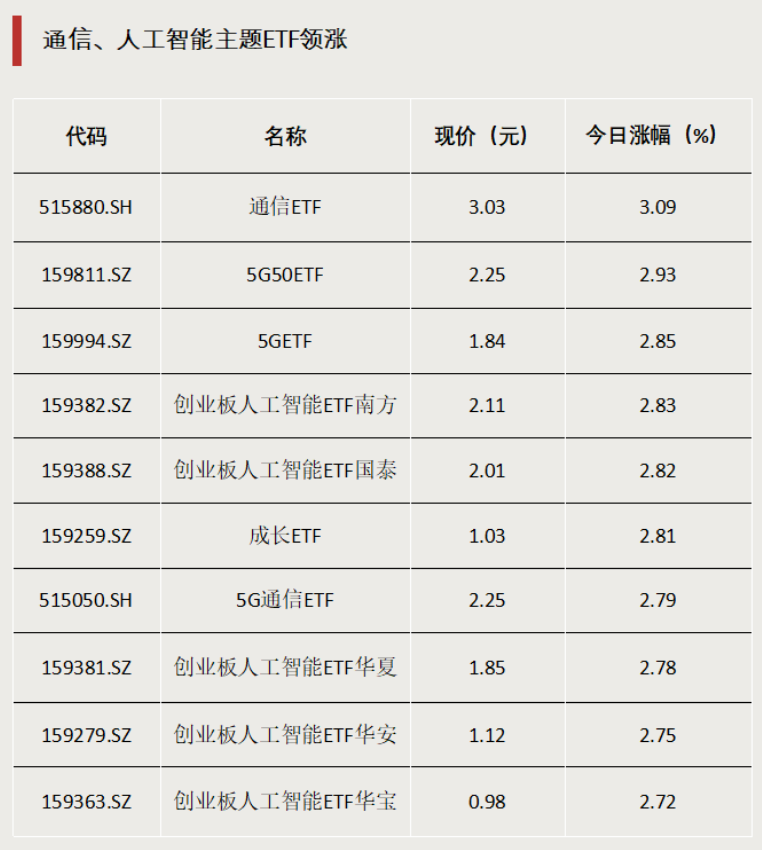 12月9日,科技板塊表現(xiàn)亮眼,多只相關(guān)主題ETF漲幅明顯。其中,通信ETF(515880)漲幅超3%,位居全市場ETF漲幅第一名。創(chuàng)業(yè)板人工智能ETF南方(159382)、成長ETF(159259)等漲超2.5%。