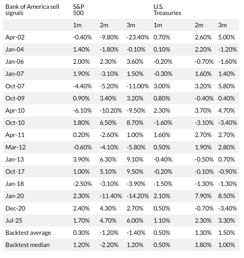 美國銀行認(rèn)為,任何超過8的數(shù)值都會(huì)觸發(fā)“拋售信號(hào)”。自2002年以來的16次“命中”記錄顯示,標(biāo)普500指數(shù)在隨后的三個(gè)月內(nèi)平均下跌1.4%。而衡量全球股市的MSCI所有國家世界指數(shù)在三個(gè)月內(nèi)的平均回撤幅度更高達(dá)8.5%,且未來一個(gè)月內(nèi)的最大上漲空間僅為1.7%。