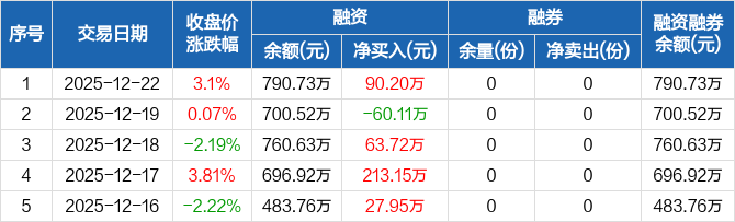 融資方面,當(dāng)日融資買(mǎi)入191.18萬(wàn)元,融資償還100.98萬(wàn)元,融資凈買(mǎi)入90.2萬(wàn)元。融券方面,融券賣(mài)出0份,融券償還0份,融券余量0份,融券余額0元。融資融券余額合計(jì)790.73萬(wàn)元。
