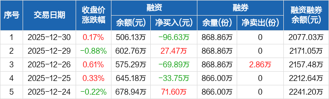 融資方面,當(dāng)日融資買入93.82萬元,融資償還190.45萬元,融資凈償還96.63萬元。融券方面,融券賣出0份,融券償還0份,融券余量868.86萬份,融券余額1570.9萬元。融資融券余額合計(jì)2077.03萬元。
