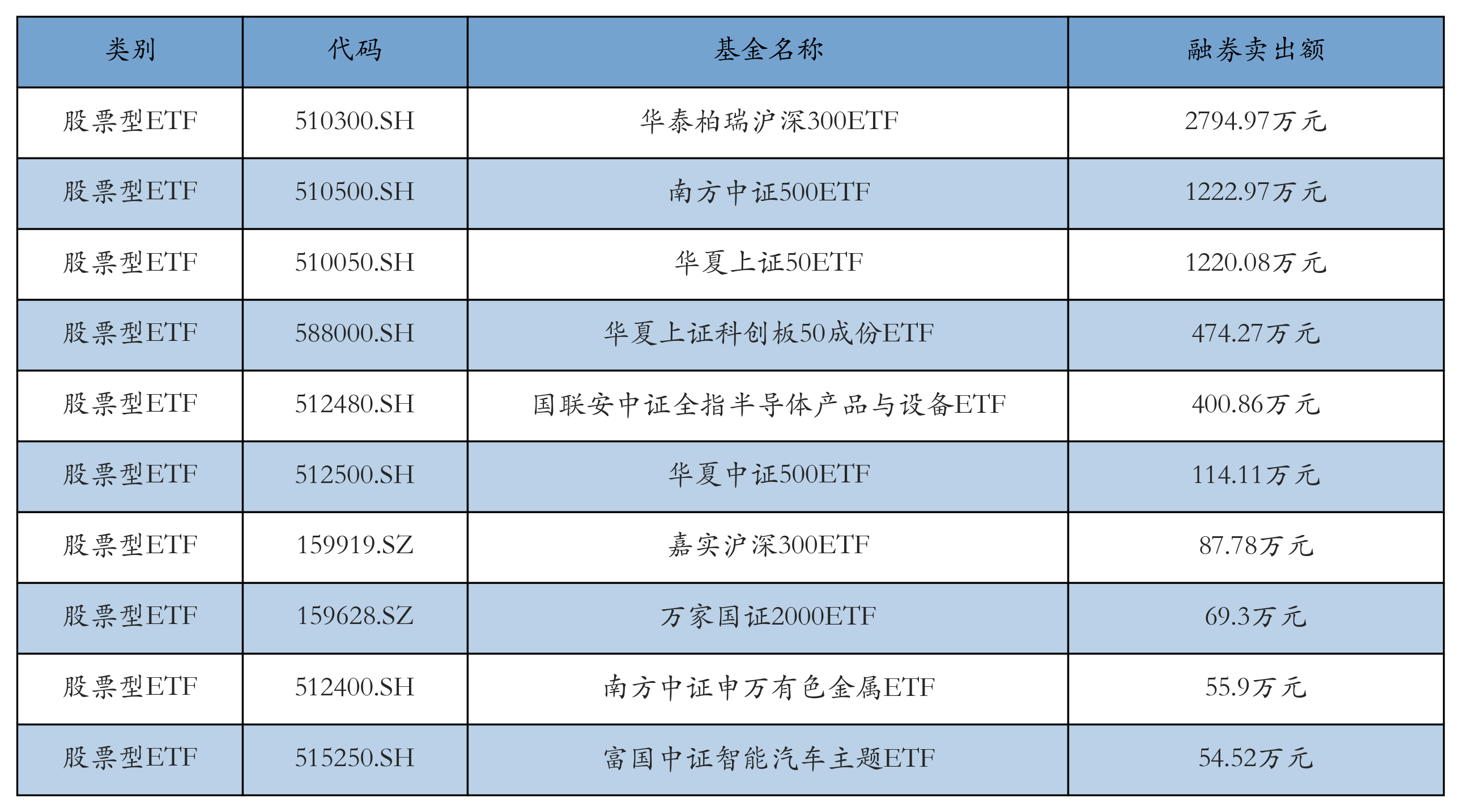 昨日股票型ETF融資賣出額最高的3只ETF及其賣出金額分別為:華泰柏瑞滬深300ETF(2794.97萬元)、南方中證500ETF(1222.97萬元)、華夏上證50ETF(1220.08萬元)。融券賣出額前10詳情見下表: