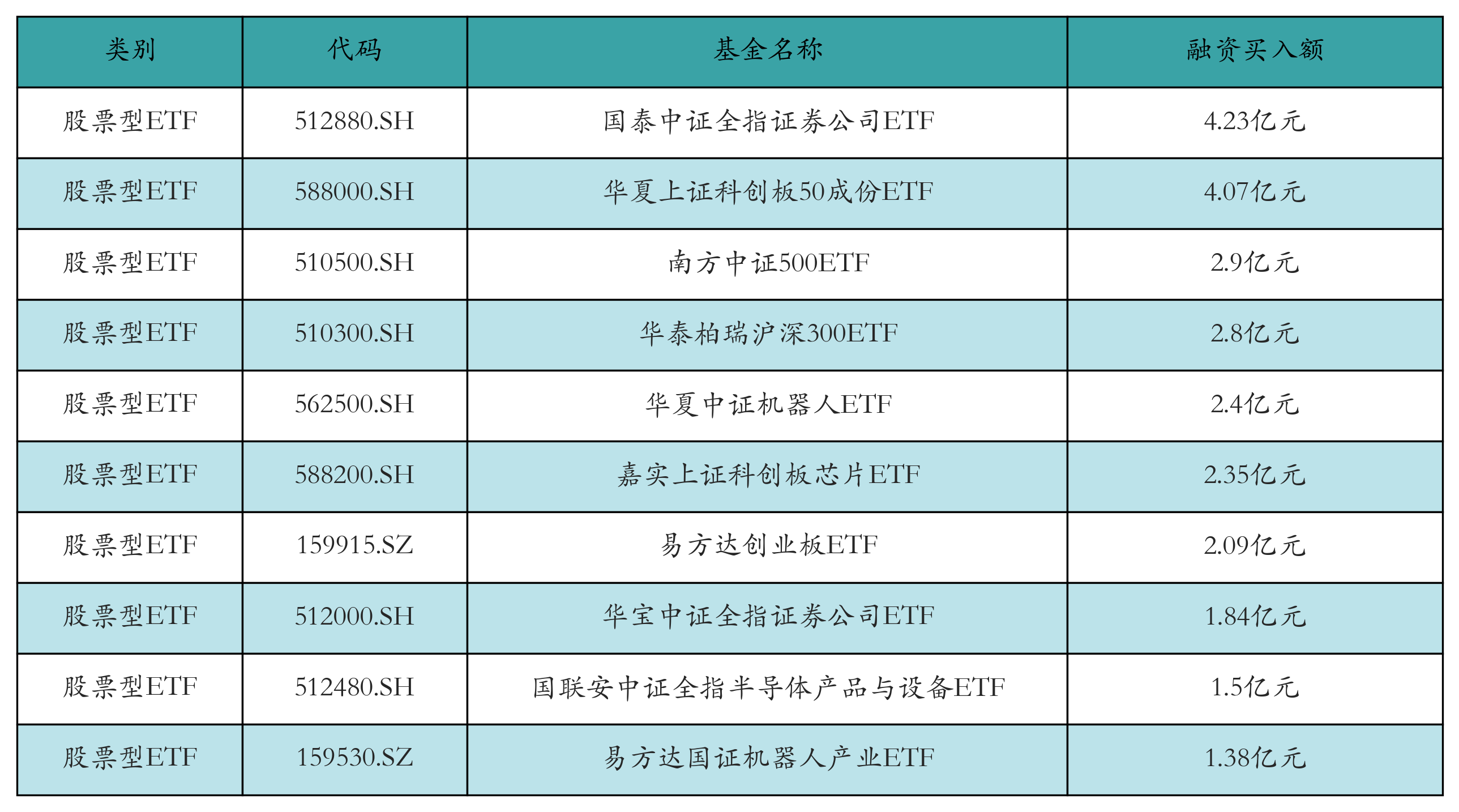 昨日股票型ETF融資買入額最高的3只ETF及其買入金額分別為:國泰中證全指證券公司ETF(4.23億元)、華夏上證科創(chuàng)板50成份ETF(4.07億元)、南方中證500ETF(2.9億元)。融資買入額前10詳情見下表: