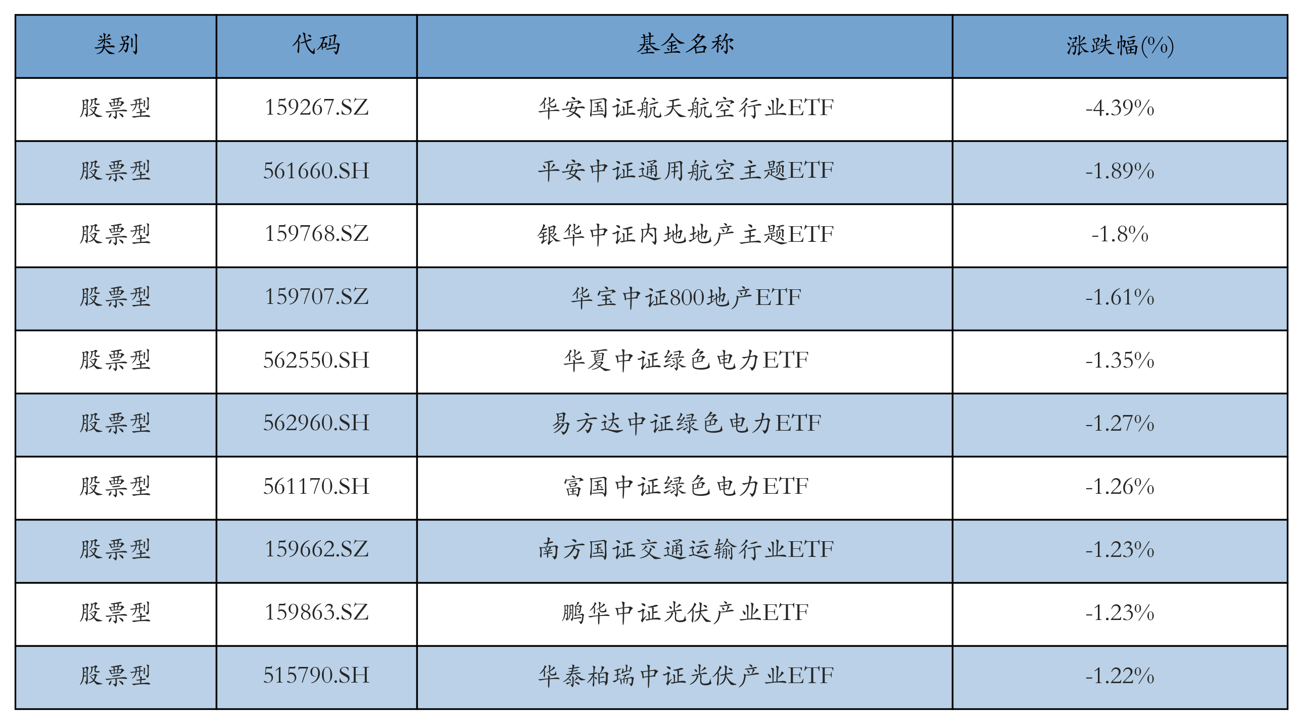昨日股票型ETF跌幅最大的3只ETF及其收益率分別為:華安國證航天航空行業(yè)ETF(-4.39%)、平安中證通用航空主題ETF(-1.89%)、銀華中證內地地產(chǎn)主題ETF(-1.8%)。跌幅前10詳情見下表:
