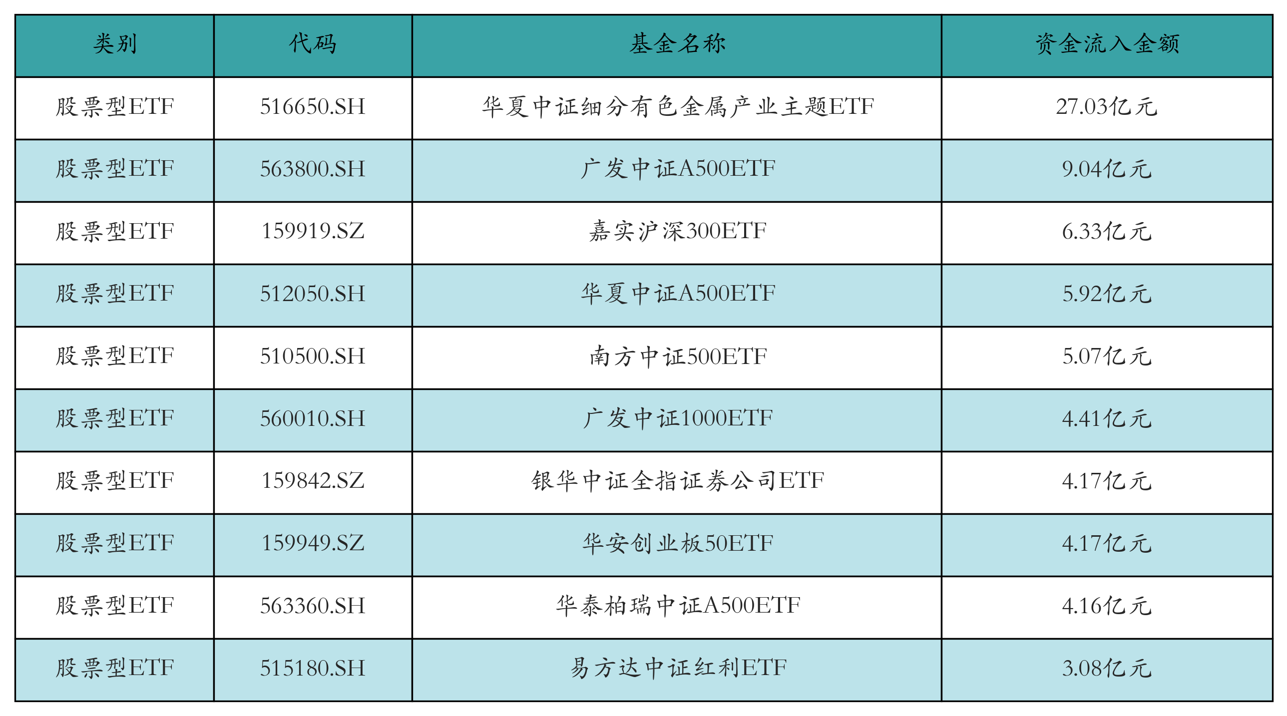 昨日股票型ETF資金流入最多的3只ETF及其流入金額分別為:華夏中證細分有色金屬產(chǎn)業(yè)主題ETF(流入27.03億元)、廣發(fā)中證A500ETF(流入9.04億元)、嘉實滬深300ETF(流入6.33億元)。資金流入前10詳情見下表: