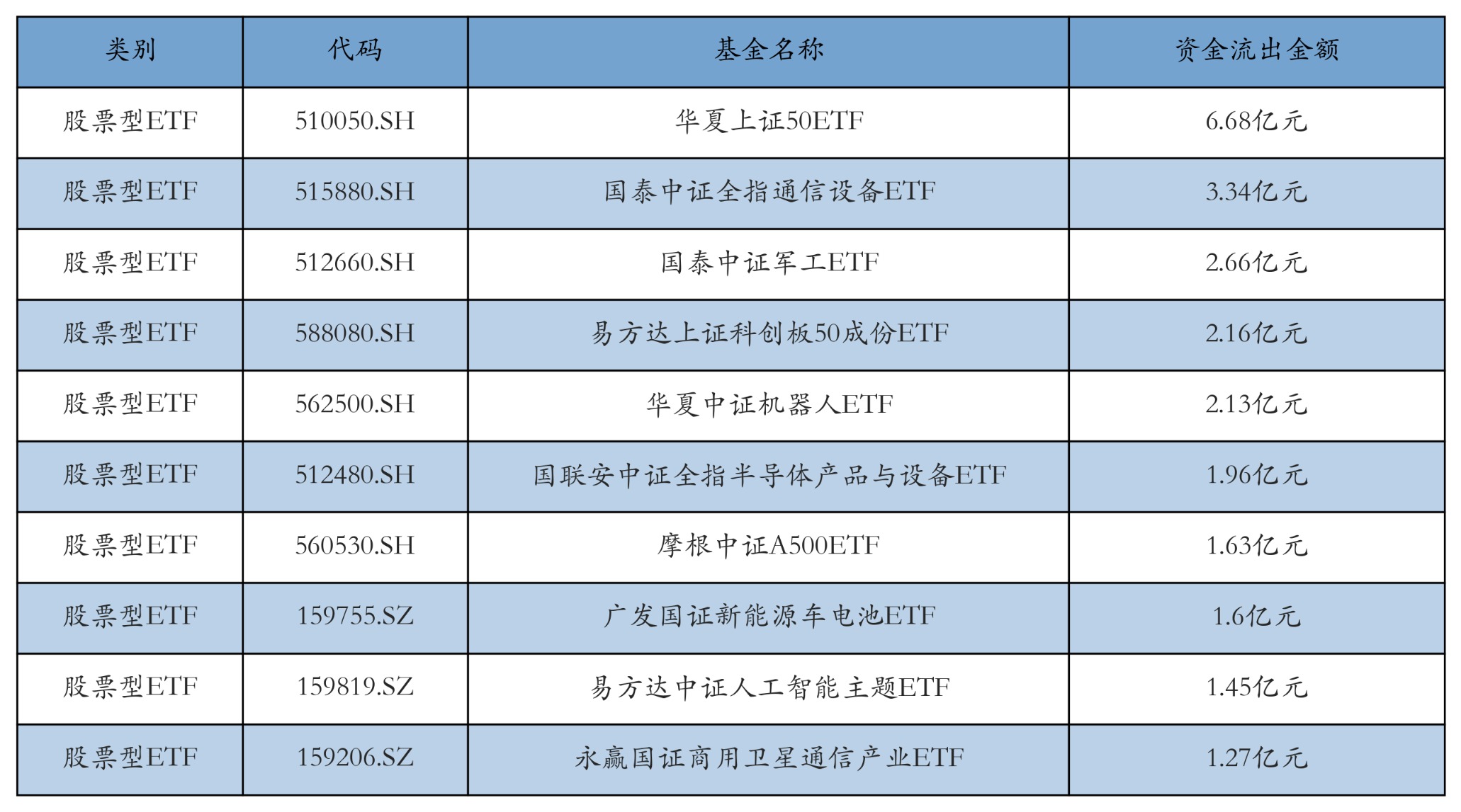 昨日股票型ETF資金流出最多的3只ETF及其流出金額分別為:華夏上證50ETF(流出6.68億元)、國泰中證全指通信設備ETF(流出3.34億元)、國泰中證軍工ETF(流出2.66億元)。資金流出前10詳情見下表: