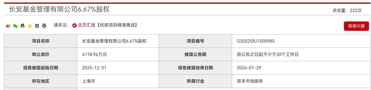近日,長安基金6.67%股權(quán)在北京產(chǎn)權(quán)交易所掛牌,轉(zhuǎn)讓方為兵器裝備集團(tuán)財務(wù)有限責(zé)任公司,底價為4118.96萬元。記者注意到,這部分股權(quán)并不是第一次掛牌轉(zhuǎn)讓,早在2021年和2022年,就曾以3700萬元的底價多次掛牌轉(zhuǎn)讓。