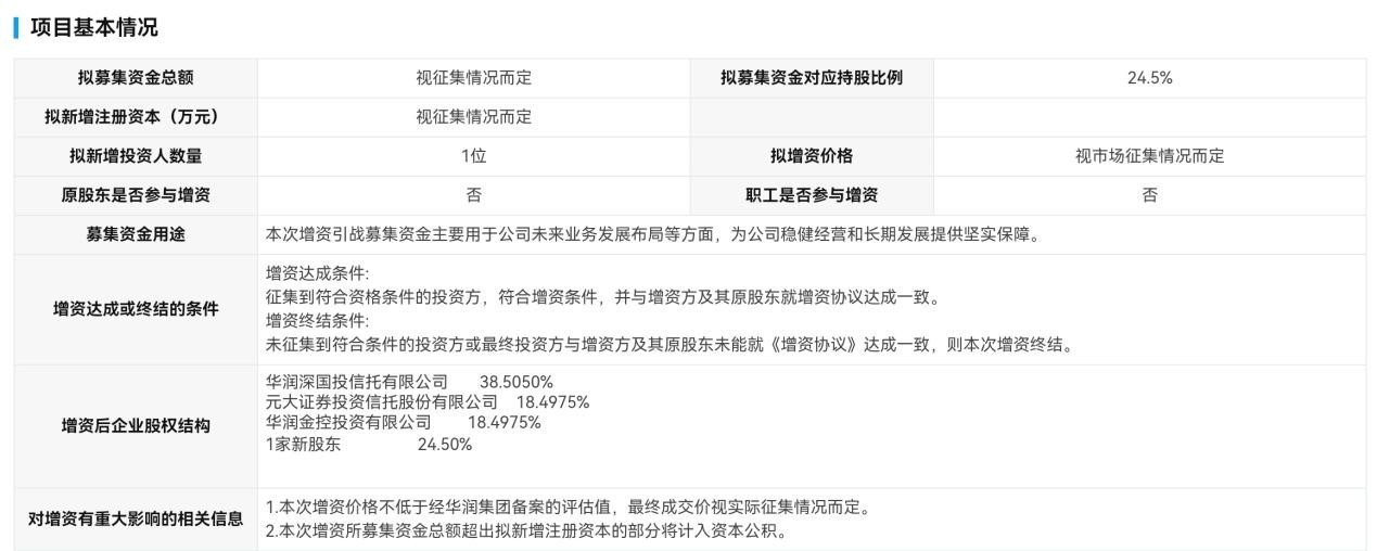 披露的信息顯示,此次募集資金對應(yīng)的持股比例達(dá)24.5%,增資價格不低于經(jīng)華潤集團(tuán)備案的評估值,最終成交價視實際征集情況而定。