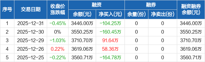 融資方面,當(dāng)日融資買(mǎi)入102.66萬(wàn)元,融資償還206.91萬(wàn)元,融資凈償還104.25萬(wàn)元。融券方面,融券賣(mài)出0份,融券償還0份,融券余量0份,融券余額0元。融資融券余額合計(jì)3446萬(wàn)元。