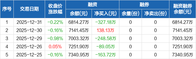融資方面,當(dāng)日融資買入256.84萬元,融資償還584.02萬元,融資凈償還327.18萬元。融券方面,融券賣出0份,融券償還0份,融券余量0份,融券余額0元。融資融券余額合計6814.27萬元。