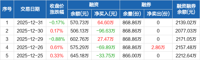融資方面,當(dāng)日融資買入125.66萬元,融資償還61.06萬元,融資凈買入64.6萬元。融券方面,融券賣出0份,融券償還0份,融券余量868.86萬份,融券余額1568.29萬元。融資融券余額合計2139.02萬元。