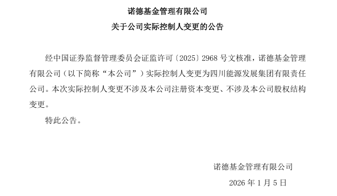 1月5日,諾德基金發(fā)布公告稱,經(jīng)證監(jiān)會核準(zhǔn),公司實際控制人變更為四川能源發(fā)展集團(tuán)有限責(zé)任公司,本次實際控制人變更不涉及公司注冊資本與股權(quán)結(jié)構(gòu)變更。