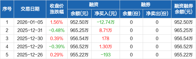 融資方面,當(dāng)日融資買入1778元,融資償還12.92萬元,融資凈償還12.74萬元。融券方面,融券賣出0份,融券償還0份,融券余量0份,融券余額0元。融資融券余額合計(jì)952.5萬元。
