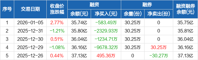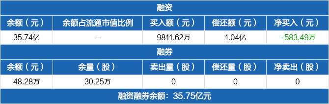 融資方面,當(dāng)日融資買入9811.62萬元,融資償還1.04億元,融資凈償還583.49萬元,連續(xù)4日凈償還累計(jì)1.38億元。融券方面,融券賣出0份,融券償還0份,融券余量30.25萬份,融券余額48.28萬元。融資融券余額合計(jì)35.75億元。