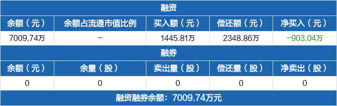 融資方面,當(dāng)日融資買入1445.81萬元,融資償還2348.86萬元,融資凈償還903.04萬元。融券方面,融券賣出0份,融券償還0份,融券余量0份,融券余額0元。融資融券余額合計7009.74萬元。