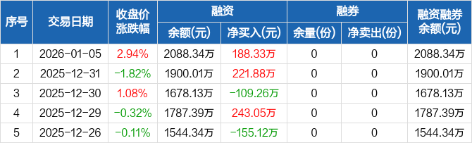 融資方面,當(dāng)日融資買入444.81萬元,融資償還256.49萬元,融資凈買入188.33萬元。融券方面,融券賣出0份,融券償還0份,融券余量0份,融券余額0元。融資融券余額合計(jì)2088.34萬元。