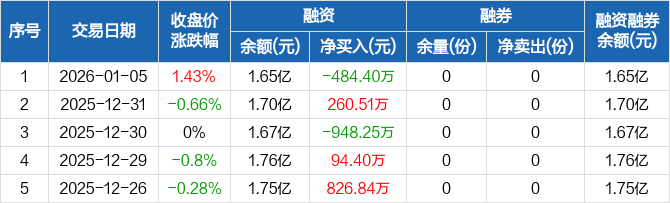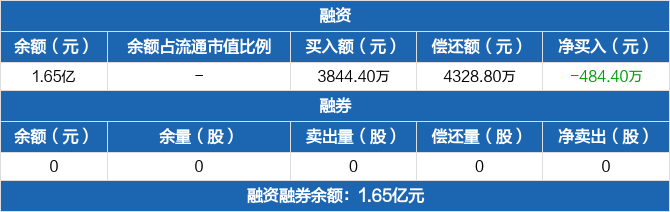 融資方面,當日融資買入3844.4萬元,融資償還4328.8萬元,融資凈償還484.4萬元。融券方面,融券賣出0份,融券償還0份,融券余量0份,融券余額0元。融資融券余額合計1.65億元。