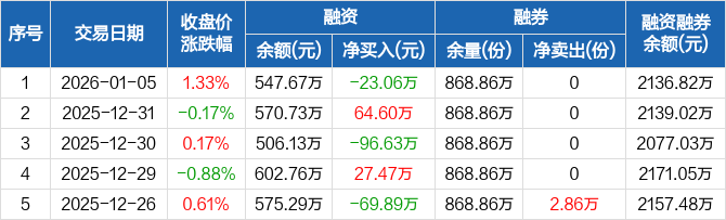 融資方面,當(dāng)日融資買入177.3萬元,融資償還200.36萬元,融資凈償還23.06萬元。融券方面,融券賣出0份,融券償還0份,融券余量868.86萬份,融券余額1589.14萬元。融資融券余額合計(jì)2136.82萬元。