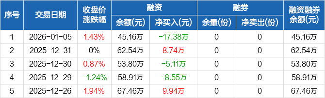 融資方面,當日融資買入26.17萬元,融資償還43.55萬元,融資凈償還17.38萬元。融券方面,融券賣出0份,融券償還0份,融券余量0份,融券余額0元。融資融券余額合計45.16萬元。