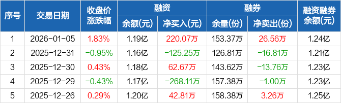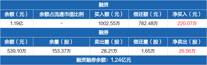 融資方面,當(dāng)日融資買入1002.55萬元,融資償還782.48萬元,融資凈買入220.07萬元。融券方面,融券賣出28.21萬份,融券償還1.65萬份,融券余量153.37萬份,融券余額539.1萬元。融資融券余額合計1.24億元。