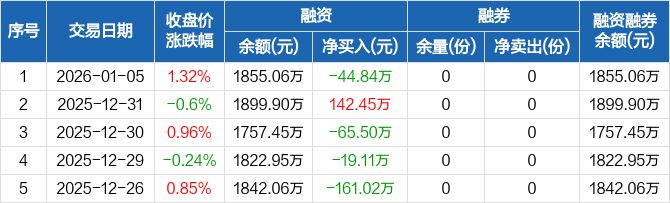 融資方面,當(dāng)日融資買入480.28萬元,融資償還525.12萬元,融資凈償還44.84萬元。融券方面,融券賣出0份,融券償還0份,融券余量0份,融券余額0元。融資融券余額合計(jì)1855.06萬元。