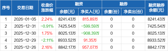 融資方面,當(dāng)日融資買入1956.73萬元,融資償還1140.84萬元,融資凈買入815.89萬元。融券方面,融券賣出0份,融券償還0份,融券余量0份,融券余額0元。融資融券余額合計8241.43萬元。