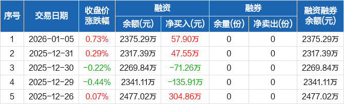 融資方面,當(dāng)日融資買入1168.54萬元,融資償還1110.64萬元,融資凈買入57.9萬元。融券方面,融券賣出0份,融券償還0份,融券余量0份,融券余額0元。融資融券余額合計2375.29萬元。