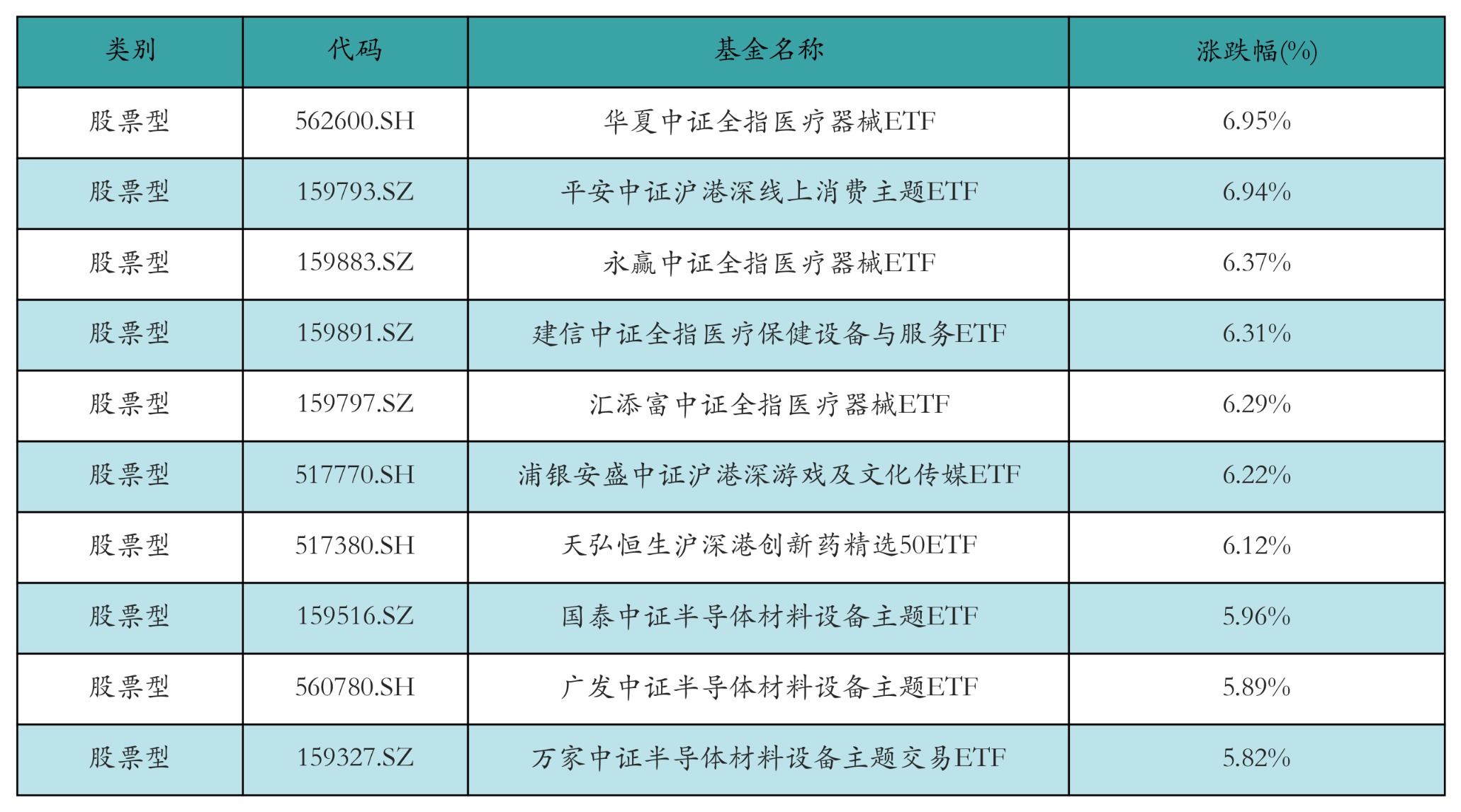 昨日股票型ETF漲幅最高的3只ETF及其收益率分別為:華夏中證全指醫(yī)療器械ETF(6.95%)、平安中證滬港深線上消費(fèi)主題ETF(6.94%)、永贏中證全指醫(yī)療器械ETF(6.37%)。漲幅前10詳情見(jiàn)下表: