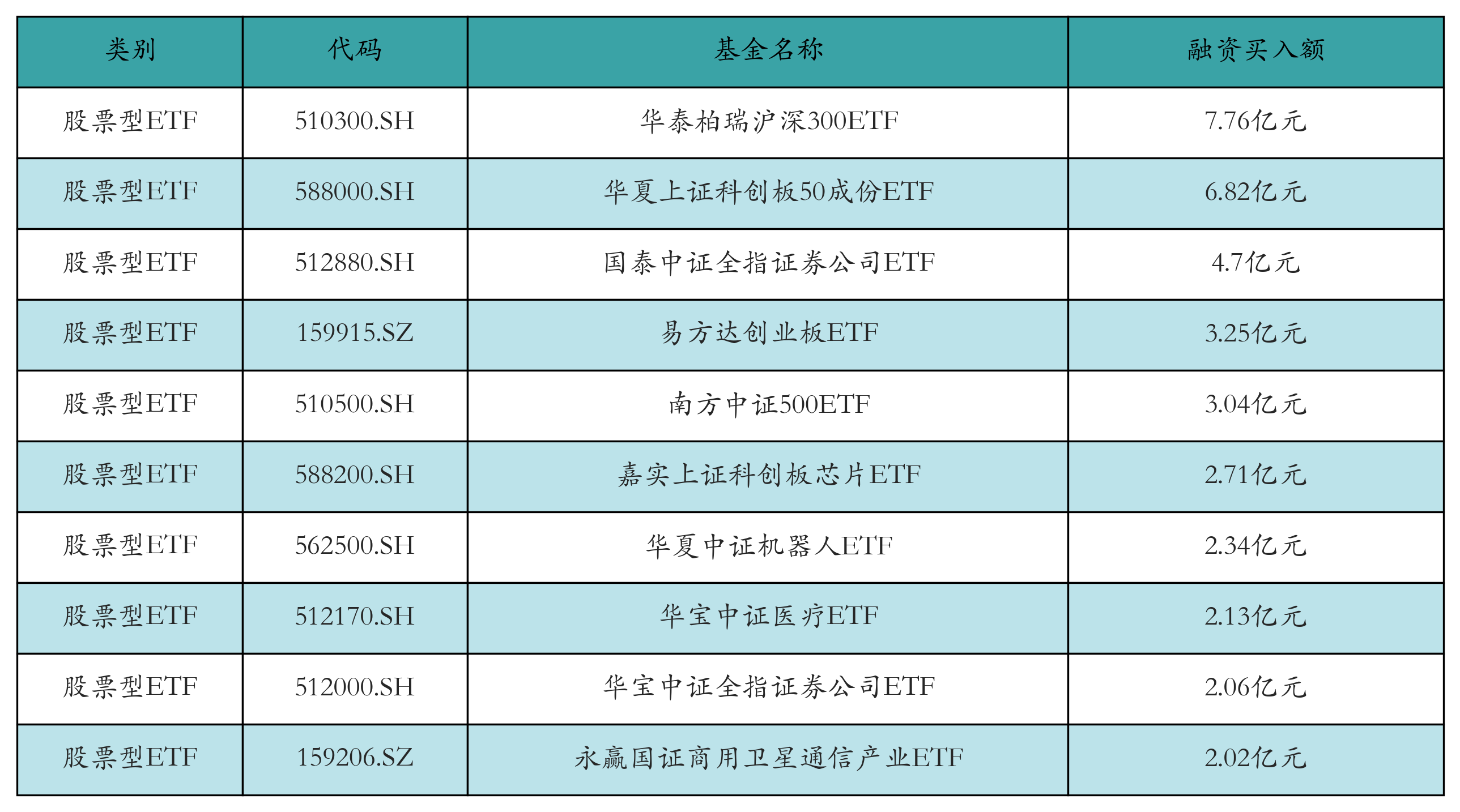 昨日股票型ETF融資買入額最高的3只ETF及其買入金額分別為:華泰柏瑞滬深300ETF(7.76億元)、華夏上證科創(chuàng)板50成份ETF(6.82億元)、國(guó)泰中證全指證券公司ETF(4.7億元)。融資買入額前10詳情見(jiàn)下表: