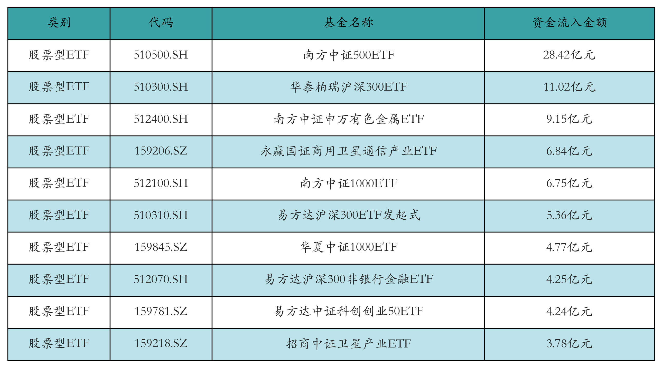 昨日股票型ETF資金流入最多的3只ETF及其流入金額分別為:南方中證500ETF(流入28.42億元)、華泰柏瑞滬深300ETF(流入11.02億元)、南方中證申萬(wàn)有色金屬ETF(流入9.15億元)。資金流入前10詳情見(jiàn)下表: