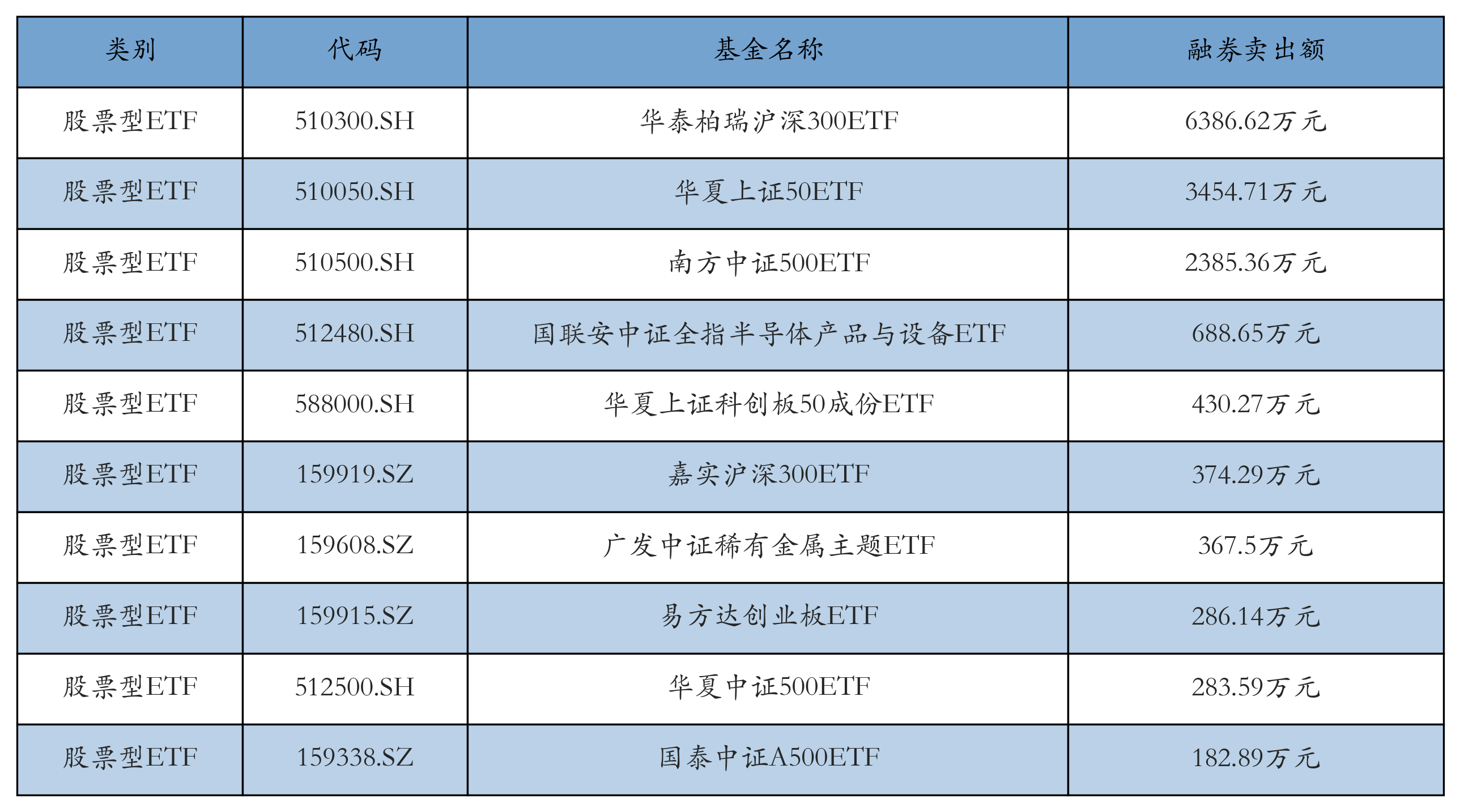 昨日股票型ETF融資賣出額最高的3只ETF及其賣出金額分別為:華泰柏瑞滬深300ETF(6386.62萬(wàn)元)、華夏上證50ETF(3454.71萬(wàn)元)、南方中證500ETF(2385.36萬(wàn)元)。融券賣出額前10詳情見(jiàn)下表: