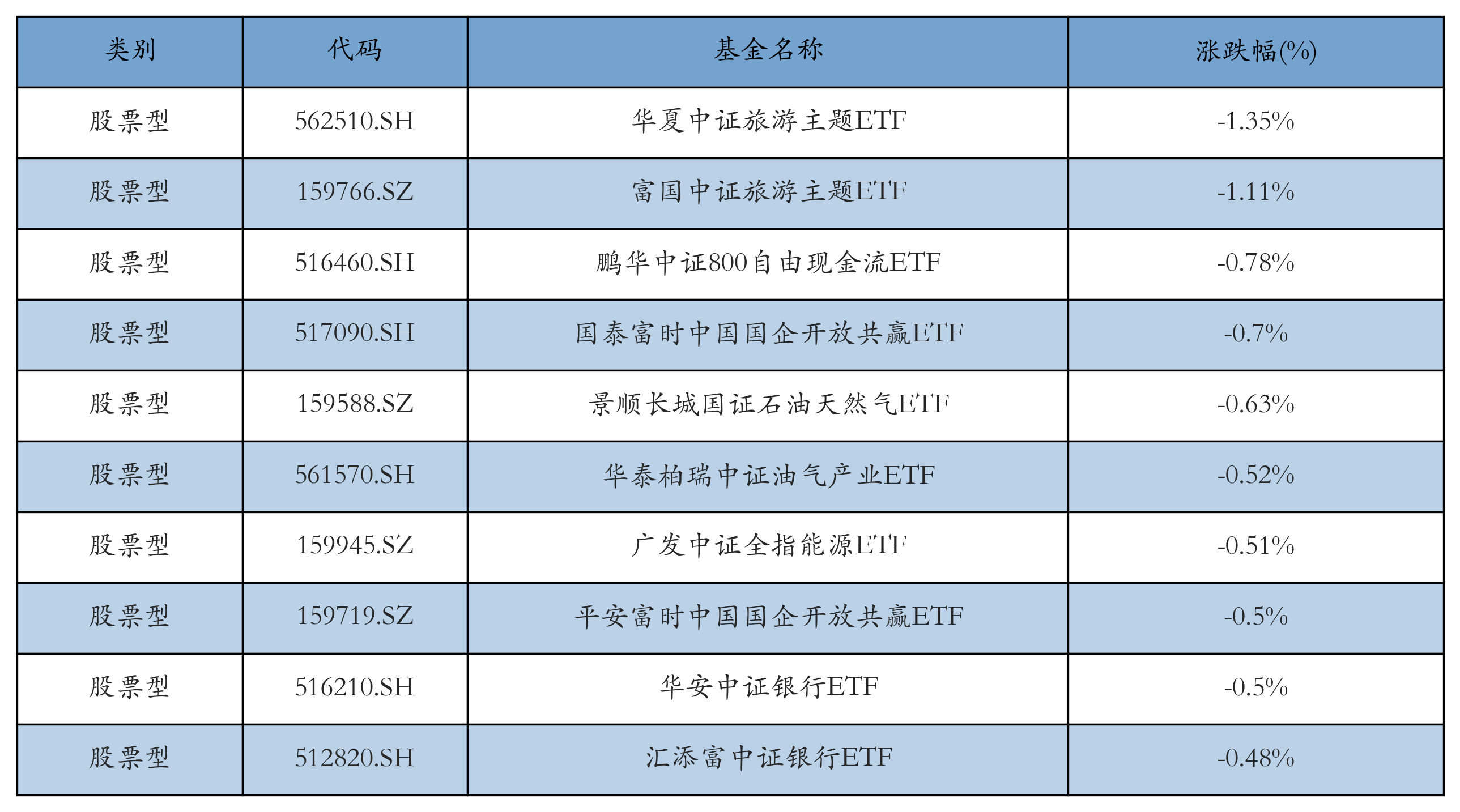 昨日股票型ETF跌幅最大的3只ETF及其收益率分別為:華夏中證旅游主題ETF(-1.35%)、富國(guó)中證旅游主題ETF(-1.11%)、鵬華中證800自由現(xiàn)金流ETF(-0.78%)。跌幅前10詳情見(jiàn)下表: