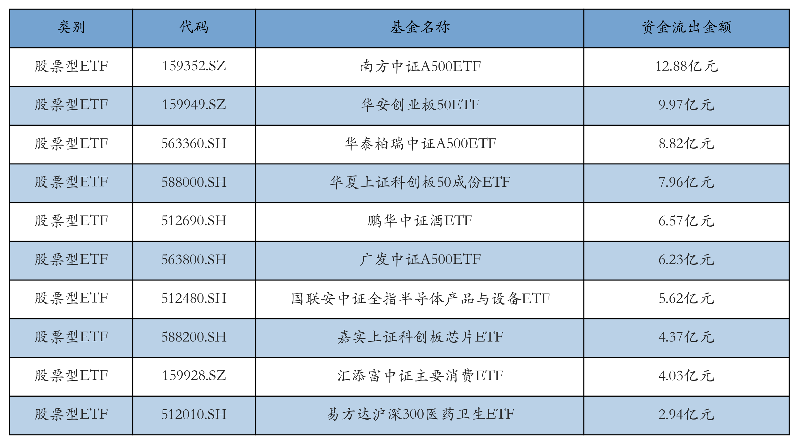 昨日股票型ETF資金流出最多的3只ETF及其流出金額分別為:南方中證A500ETF(流出12.88億元)、華安創(chuàng)業(yè)板50ETF(流出9.97億元)、華泰柏瑞中證A500ETF(流出8.82億元)。資金流出前10詳情見(jiàn)下表: