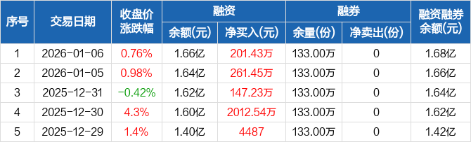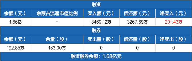 融資方面,當(dāng)日融資買(mǎi)入3469.12萬(wàn)元,融資償還3267.69萬(wàn)元,融資凈買(mǎi)入201.43萬(wàn)元,連續(xù)9日凈買(mǎi)入累計(jì)4084.61萬(wàn)元。融券方面,融券賣(mài)出0份,融券償還0份,融券余量133萬(wàn)份,融券余額192.85萬(wàn)元。融資融券余額合計(jì)1.68億元。