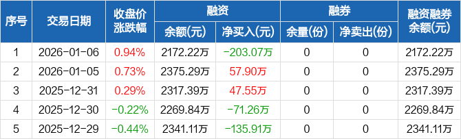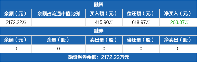 融資方面,當(dāng)日融資買入415.9萬元,融資償還618.97萬元,融資凈償還203.07萬元。融券方面,融券賣出0份,融券償還0份,融券余量0份,融券余額0元。融資融券余額合計(jì)2172.22萬元。