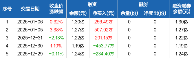 融資方面,當(dāng)日融資買入1979.4萬(wàn)元,融資償還1722.91萬(wàn)元,融資凈買入256.49萬(wàn)元,連續(xù)3日凈買入累計(jì)1055.56萬(wàn)元。融券方面,融券賣出0份,融券償還0份,融券余量0份,融券余額0元。融資融券余額合計(jì)1.3億元。