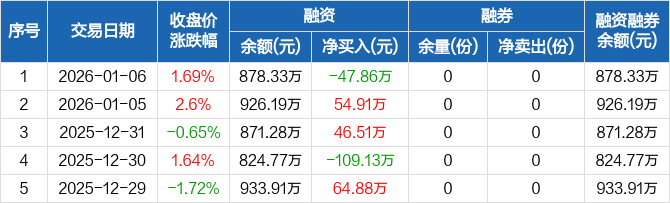 融資方面,當(dāng)日融資買入99.48萬(wàn)元,融資償還147.34萬(wàn)元,融資凈償還47.86萬(wàn)元。融券方面,融券賣出0份,融券償還0份,融券余量0份,融券余額0元。融資融券余額合計(jì)878.33萬(wàn)元。