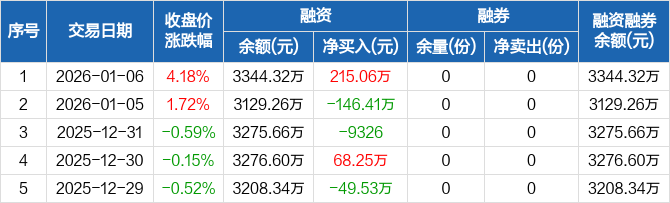融資方面,當(dāng)日融資買入1242.02萬元,融資償還1026.95萬元,融資凈買入215.06萬元。融券方面,融券賣出0份,融券償還0份,融券余量0份,融券余額0元。融資融券余額合計(jì)3344.32萬元。