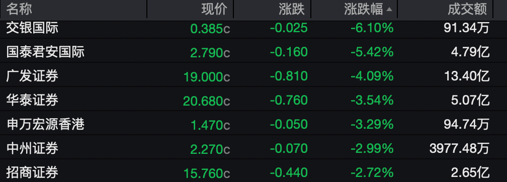 金融板塊今日轉(zhuǎn)跌,其中券商股跌幅較大。交銀國(guó)際跌超6%,國(guó)泰君安跌超5%,廣發(fā)證券、華泰證券、申萬(wàn)宏源跌幅超3%。