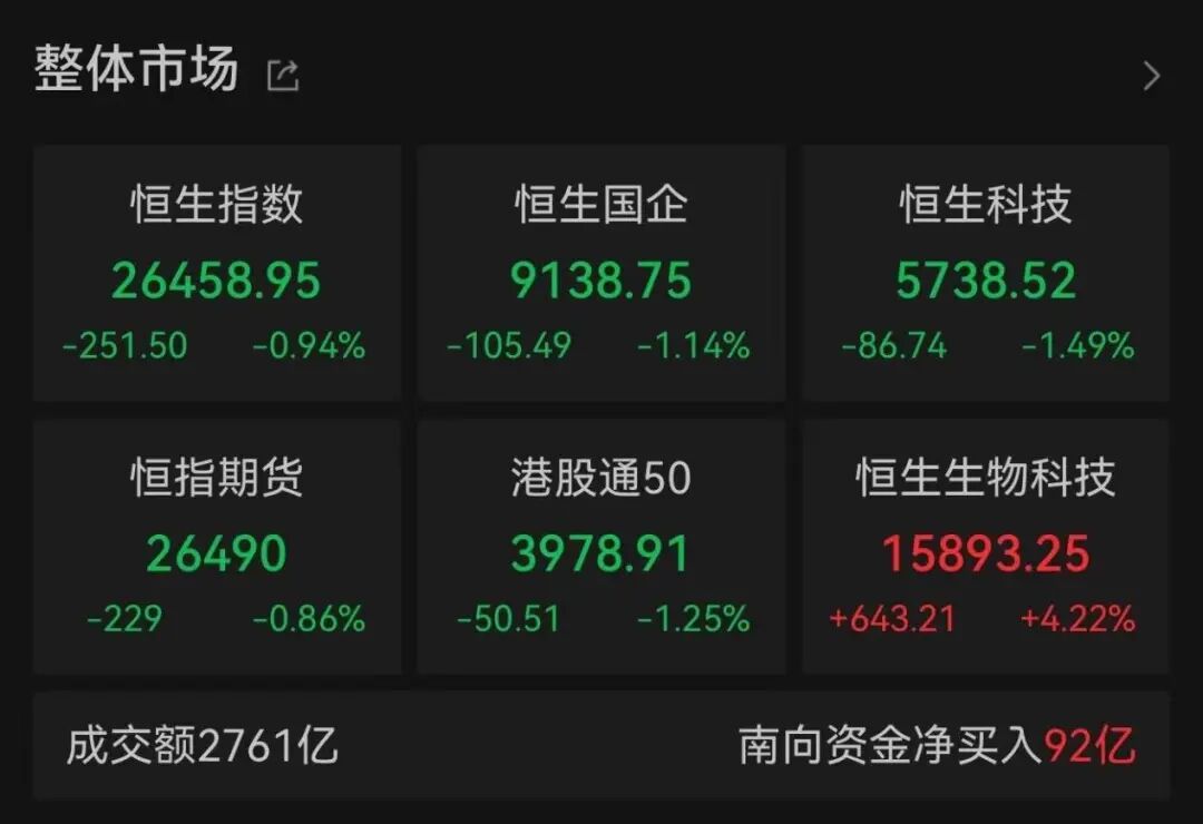 港股市場(chǎng)今日表現(xiàn)低迷。截至收盤,恒生指數(shù)下跌0.94%,恒生國(guó)企指數(shù)下跌1.14%,恒生科技指數(shù)下跌1.49%。南向資金今日凈買入92億港元。